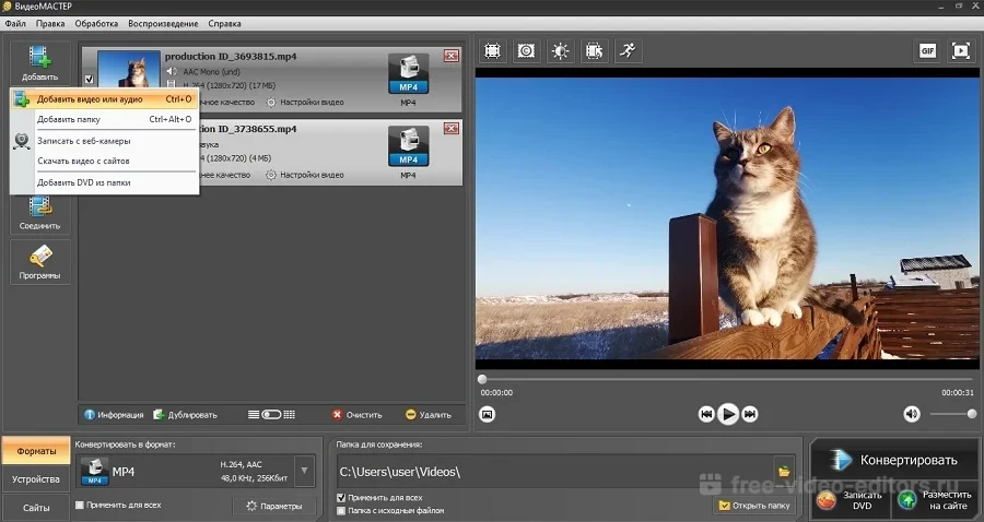 Откройте ВидеоМАСТЕР и импортируйте видеоролики, нажав кнопку «Добавить» в левом столбце. Выберите «Добавить видео и аудио», чтобы подгрузить один файл, или «Добавить папку», если вы хотите запустить пакетное редактирование. Среди других вариантов импорта присутствуют граббинг диска, запись с веб-камеры и скачивание с ВК и YouTube.