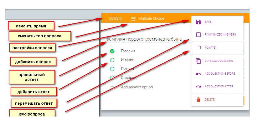 Настройки можно вызвать, кликнув на иконке справа. В опциях мы можем ответить «перемешать вопросы (randomized question)», задать вес задания (point), продублировать, переместить выше или ниже и удалить. В шапке вопроса мы можем сменить тип и время.