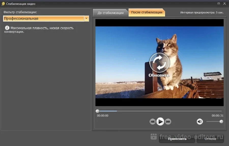 В верхнем меню программы раскройте пункт «Обработка» и прокрутите до надписи «Улучшение видео». В появившемся подменю выберите «Стабилизация изображения». Выберите фильтр: ускоренная – без анализа движения; оптимальная – более длительная, но при этом более точная; профессиональная – обработка с максимальной плавностью, но самая медленная. Если вы хотите установить параметры вручную, выберите «Настройки пользователя».