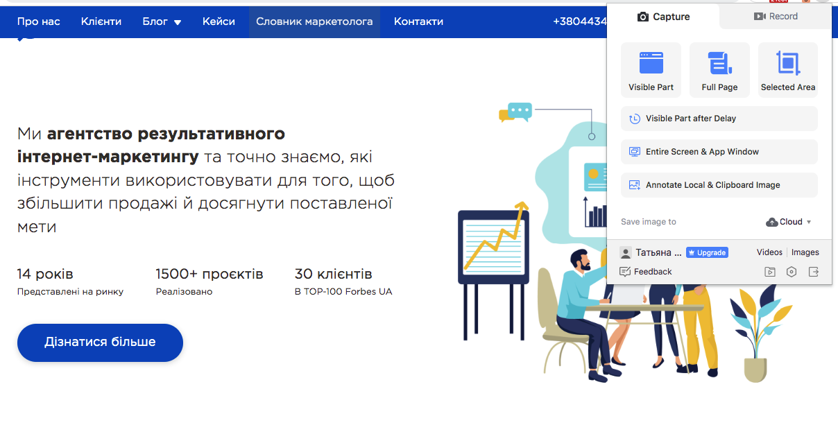 Сразу после клика захватывает содержимое страницы или ее фрагмента и сохранит в файл. Позволяет обработать во встроенном графическом редакторе, отправить в облако и поделиться ссылкой.