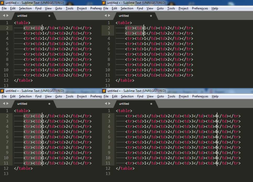 Теперь перейдем к самой главной фишки Sublime – функция множественное выделение. Для пример возьмем простую html таблицу и выделим <tr><td> (см далее скриншот 4 в 1), далее нажимаем ctrl+d и видим, что выделилась вторая строчка (скрин 2) и так нажав несколько раз мы можем выделить все строчки (скрин 3). При этом курсор будет мигать у каждой строчки, теперь мы можем писать, копировать, вставлять одно и тоже во всех строчках (скрин 4).