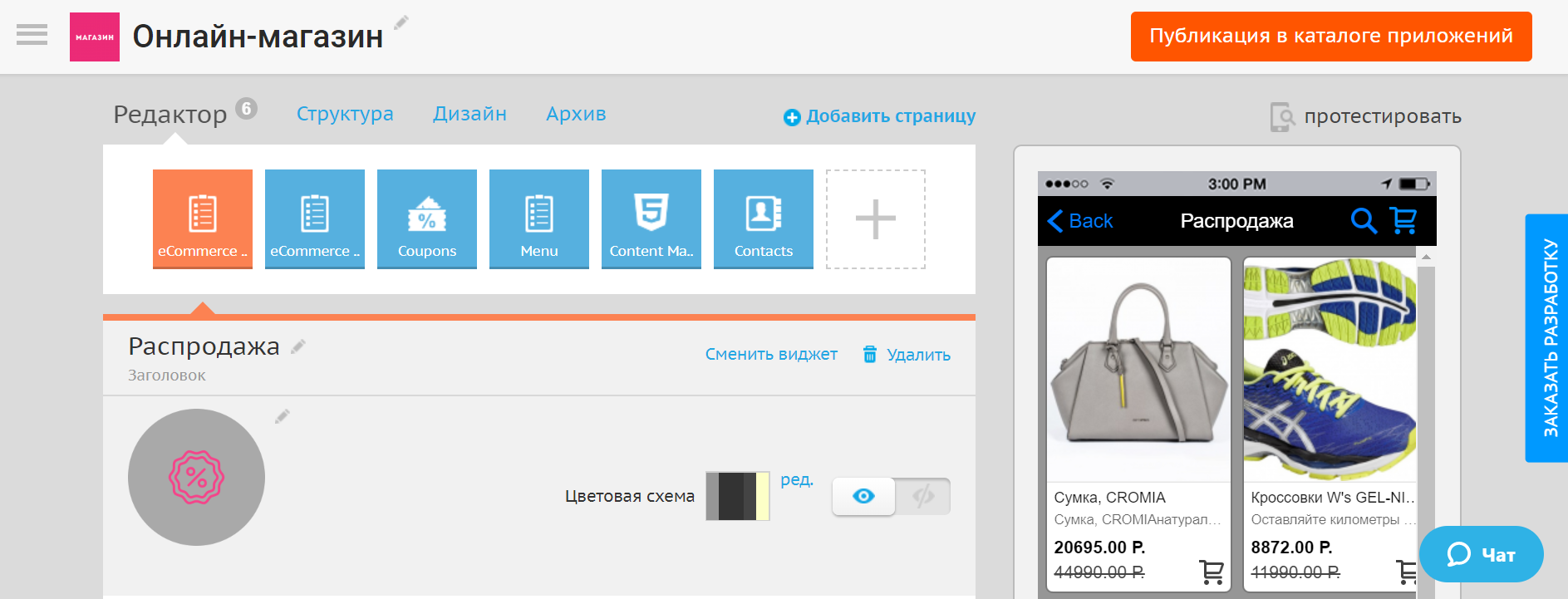 У MobiCart есть бесплатная и платная версии. В последнюю входит публикация в Google Play и App Store. Приятный бонус для новичков, которым не придётся разбираться со всеми нюансами самостоятельно.