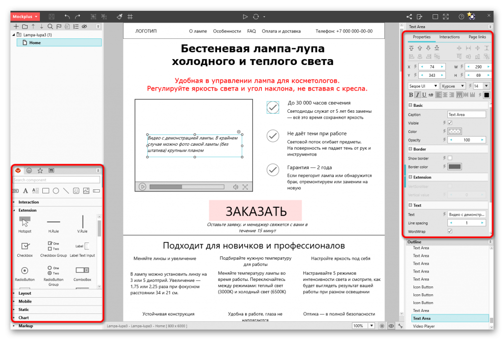 Самый простой способ сделать прототип лендинга – это рисунок от руки. Макет рисуем на бумаге, затем фотографируем и после этого преобразуем в программе POP. Но, признаться, проще и аккуратнее нарисовать отдельный макет прямо в программе. Для этого в POP есть несколько самых необходимых функций: вставить картинку, нарисовать область прямоугольной или круглой формы, указать, где разместить текст (или прямо написать тот, который подскажет копирайтер).