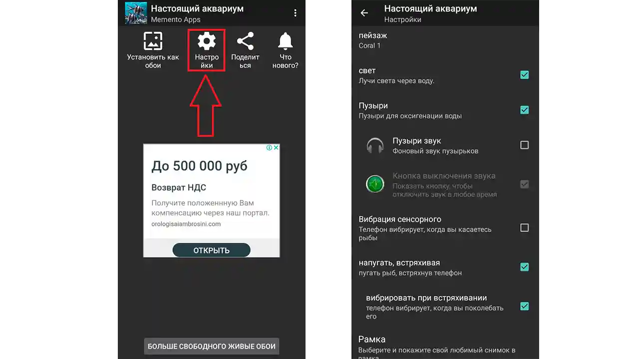 Приложение для установки обоев на телефон «Настоящий аквариум» предоставляется бесплатно. Реклама периодически появляется, но не мешает стабильной работе.