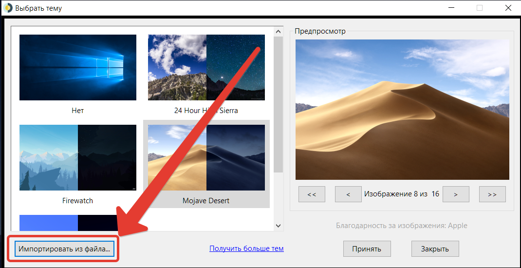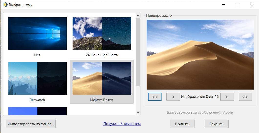 Далее можем выбрать одну из трёх предлагаемых тем Mac OS – пустыня Мохаве, солнечные градиенты или остров Санта — Каталина. Кликаем тему и жмём «Принять»…