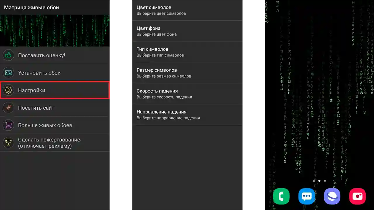 Программа ставит живые обои в формате матрицы (постоянно движущиеся столбцы). Человек сам выбирает символы, которые будут показаны, меняет их цвет или скорость падения, изменяет цвет фона, а также сменяет направление.