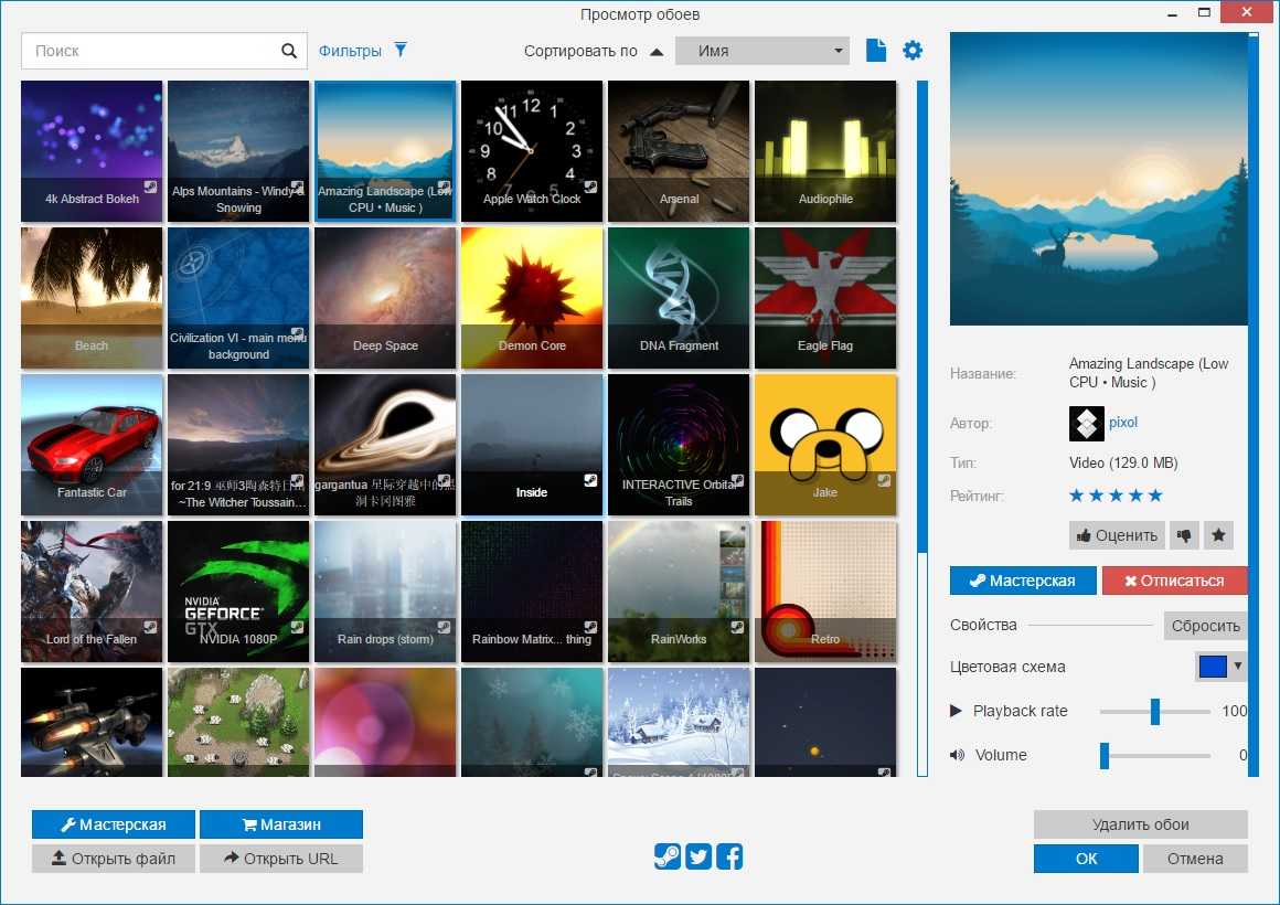 Чтобы выбрать готовые обои, достаточно просто нажать на них ЛКМ. Также по желанию можно добавлять звук и менять его громкость. Если изначального списка изображений недостаточно, можно купить новые. Находятся они в мастерской, открыть которую можно прямо через приложение.
