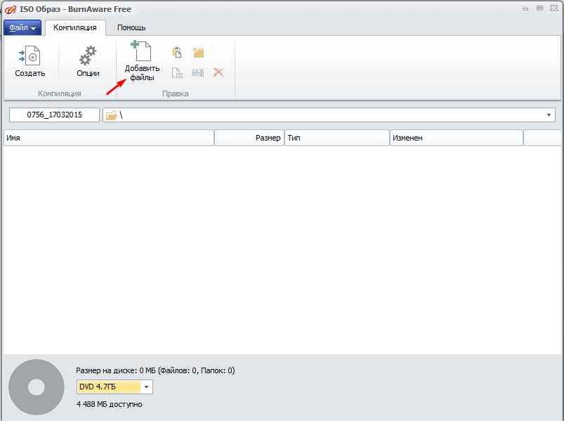 - Далее необходимо добавить файлы, которые будет содержать Ваш образ. Для этого в верхней части окна кликните по кнопке «Добавить файлы» и укажите к ним путь.
