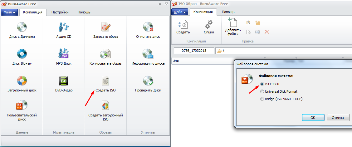 - В главном окне программы перейдите в раздел «Создать образ ISO» и в появившемся маленьком окошке выберите файловую систему «ISO 9660».
