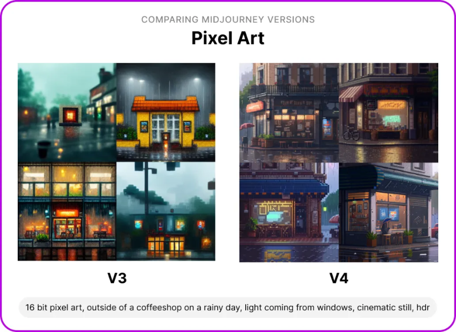 Я всегда считал, что Midjourney V3 не подходит для генерации пиксель-арта, но результаты, которые выдала Midjourney V4 поразили меня. Я даже близко не смог добиться чего-то похожего с помощью Stable Diffusion. При некоторой доработке художником изображения в качестве игровых фонов будут выглядеть невероятно.