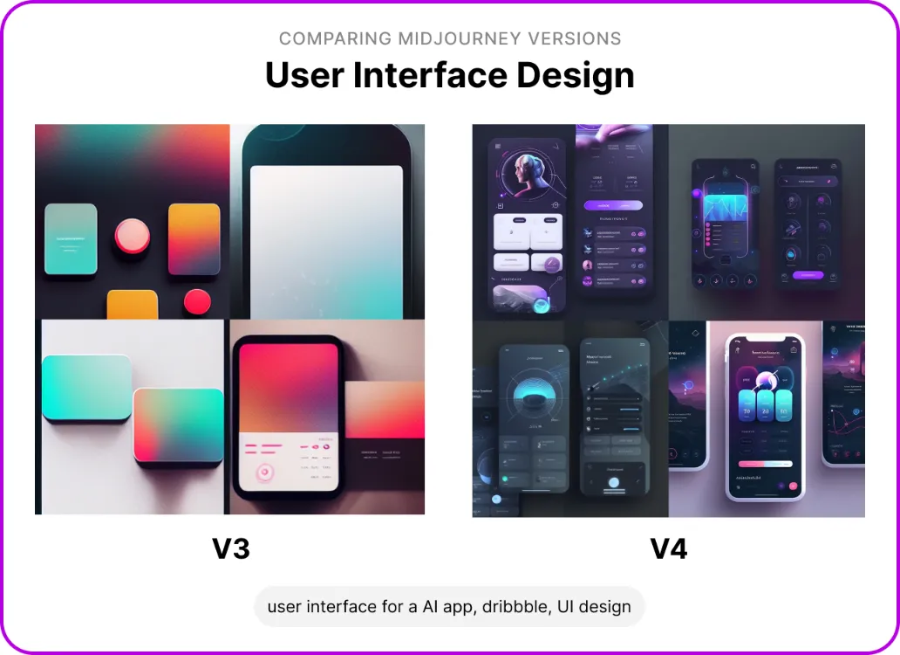 Придёт ли искусственный интеллект на смену дизайнерам интерфейсов? С Midjourney V4 похоже, что да. Если у Midjourney V3 не было чёткого представления о том, что такое интерфейсы, то Midjourney V4 хорошо в них разбирается.