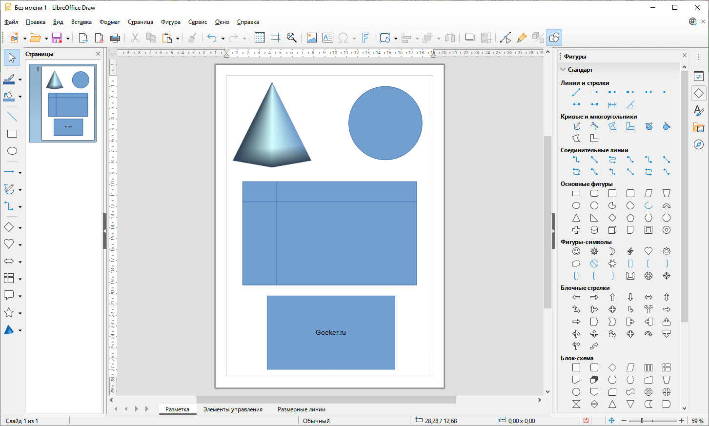 В LibreOffice Draw есть инструмент для создания простых 3D-объектов: куба, сферы и цилиндра. С его помощью можно также изменить источник света. Есть коллекция изображений, звуков и анимаций, которые можно использовать в своих работах.