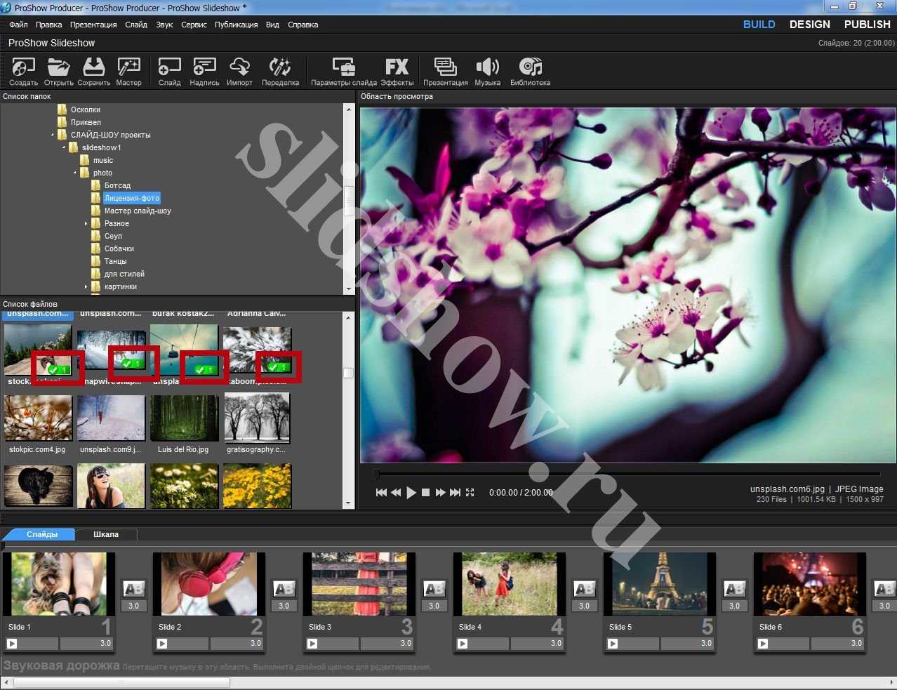 Добавьте указанное количество снимков и задайте последовательность показа. После – завершите работу в конструкторе, добавив фоновую песню. Если на примете нет ничего подходящего, загляните в музыкальную библиотеку ФотоШОУ PRO.