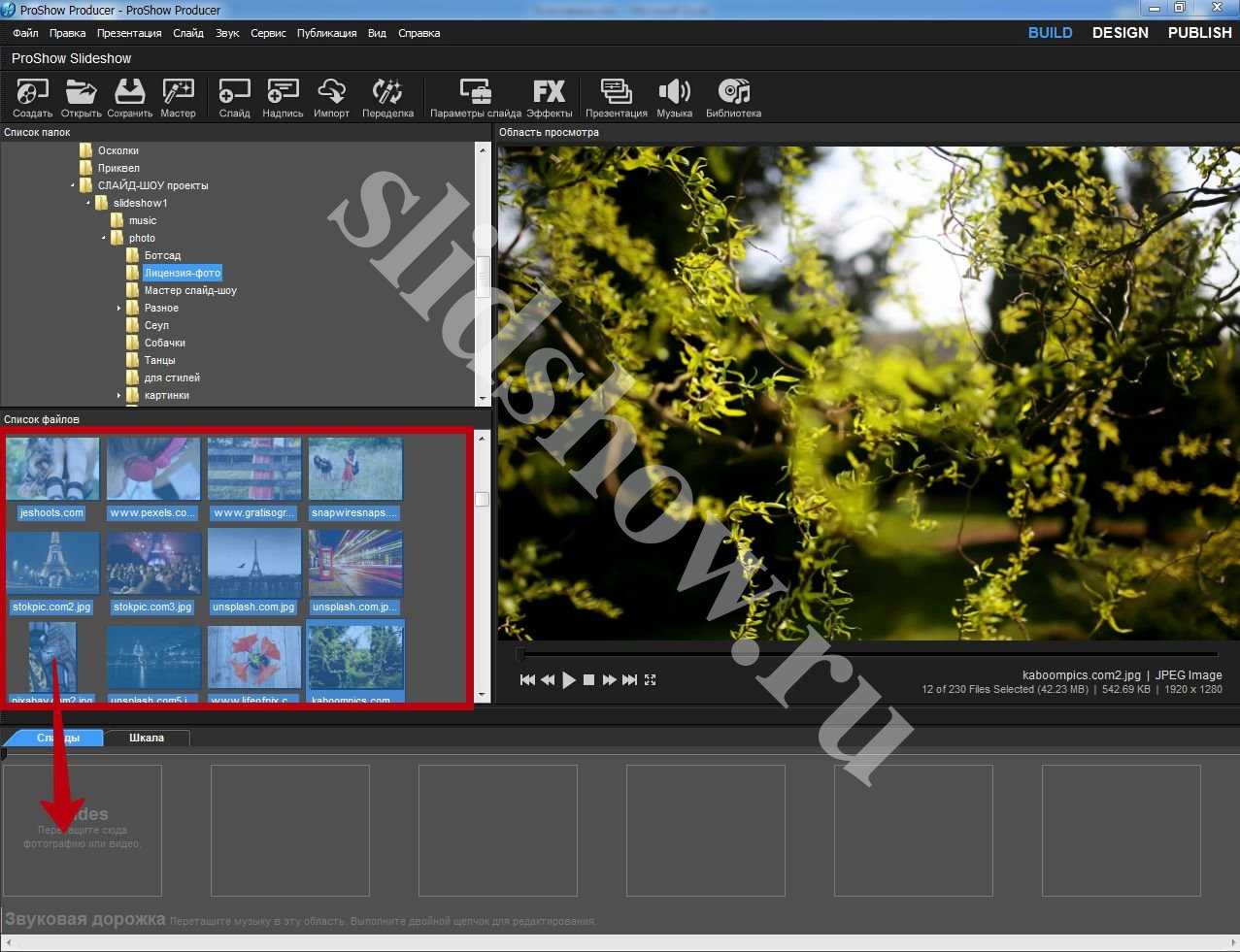 В блоке «Список папок» находим папку, куда предварительно сохранили фотографии для слайд-шоу. В блоке «Список файлов» у нас отобразятся все изображения, которые вложены в выбранную папку. Фотографии перемещаются на «Панель слайдов» при помощи захвата мышкой и перетаскивания.