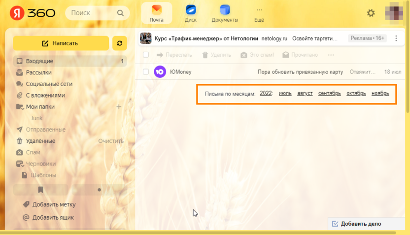 Для просмотра писем за определенный месяц или год можно воспользоваться переключателем «Письма по месяцам», который находится под списком писем.