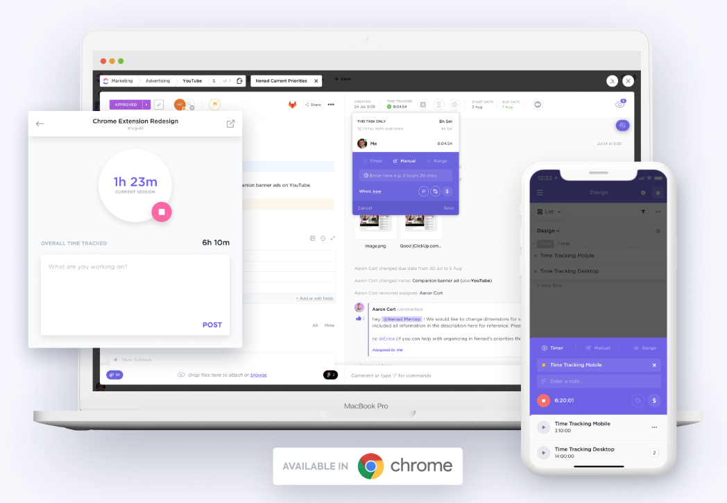 Start and stop time from any device or jump between tasks using ClickUp’s global timer. You can even retroactively or manually create entries with labels to categorize, filter, and mark time as billable! With ClickUp, you’re not just limited to tracking time spent in the platform—you can also record time spent in other browser windows and see the information updated in your workspace using ClickUp’s dynamic Chrome Extension. Plus, ClickUp integrates with more than 1,000 other tools, including PomoDone, bringing all of your work time into ClickUp in seconds.