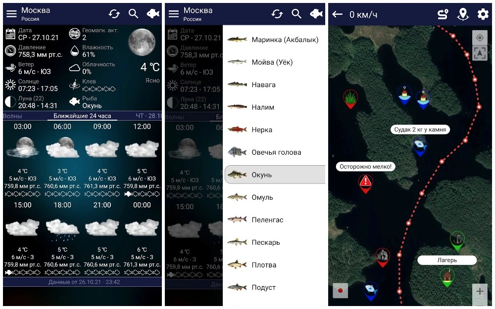 Прогноз клева — одно из лучших приложений для рыбаков. Будет информировать вас об оптимальных погодных условий для рыбалки. Может прогнозировать клев для большее 50 видов рыб. Есть возможность устанавливать рыболовные метки и записывать маршрут. В свободное время можно почитать RSS-ленту с новостями о рыбалке и охоте. Приложение бесплатное, но с рекламой.