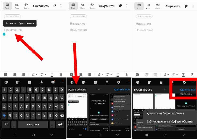 Для очистки необходимо активировать клавиатуру телефона и перейти в раздел буфера обмена. На экране появятся все фрагменты временного хранилища. Следует выбрать раздел, который нужно удалить, с помощью длинного нажатия. Появится контекстное меню с несколькими функциями, в том числе — удаление данных.