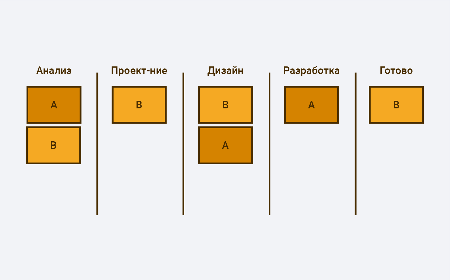 Еще один прием — разбивать доску на технологические этапы. Разработка программы часто проходит через несколько стадий: