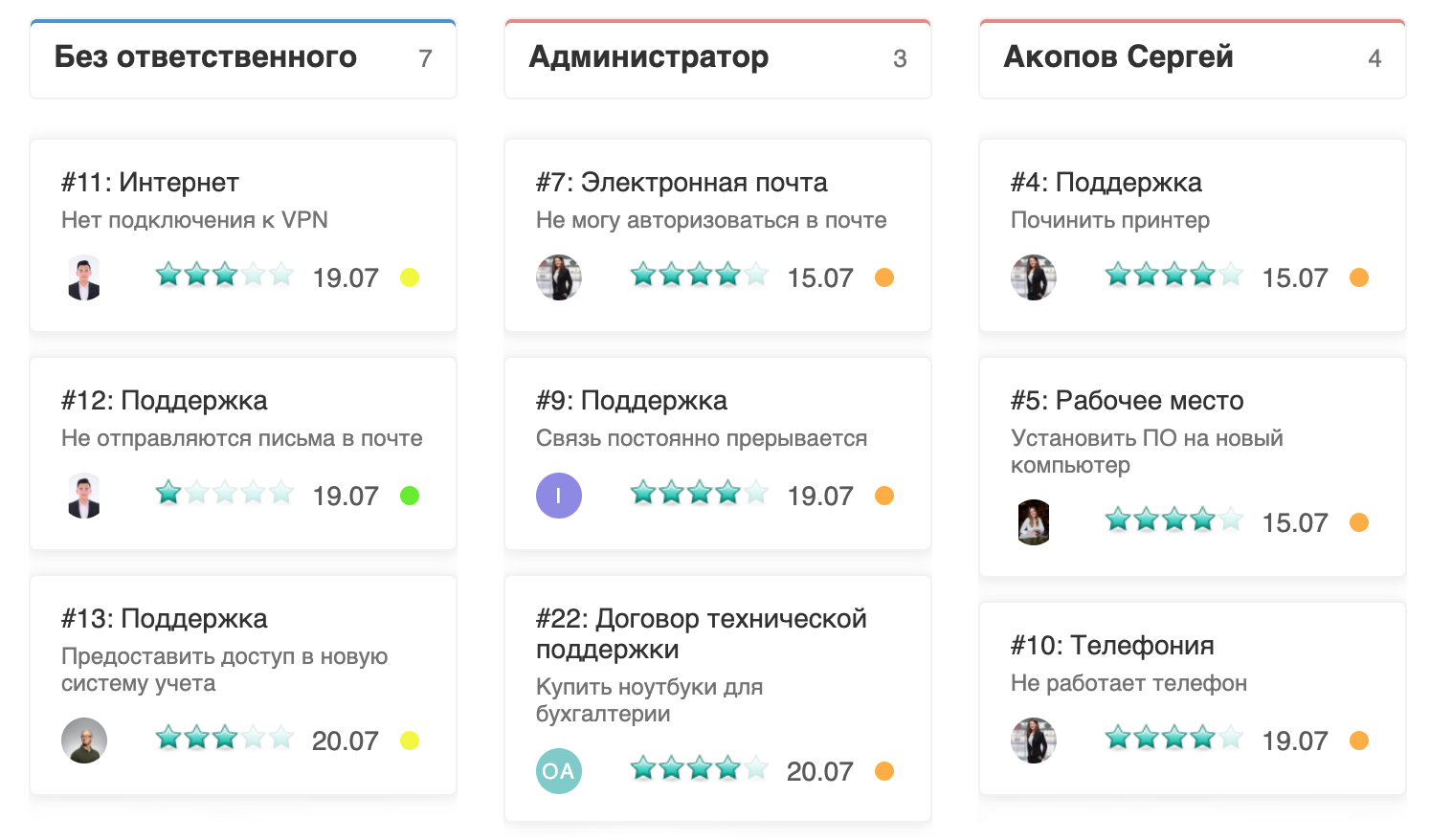 На канбан-доске собраны заявки ИТ-отдела. Слева отображаются заявки, по которым еще не назначен исполнитель, в центре и справа — те, что уже в работе у конкретных сотрудников команды
