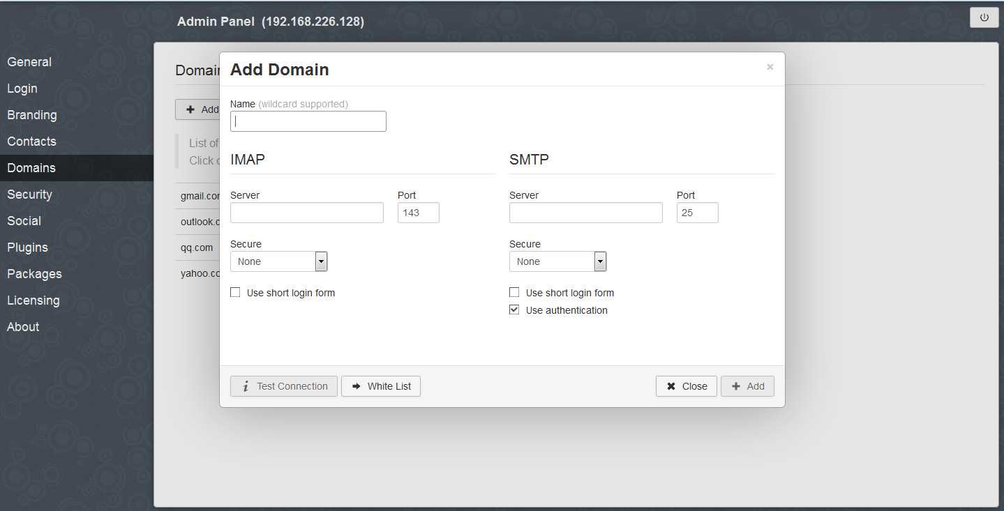 В принципе, сейчас можно зайти на страницу http://rainloop.example.org/ и попробовать подключиться к своему аккаунту Gmail (настройки для него уже есть), все должно работать. Админка находится по адресу http://rainloop.example.org/?admin, логин и пароль для входа admin и 12345. Далее настроек немного, и они, в общем, должны быть понятны без особых пояснений — указываем язык по умолчанию, лимит на размер файла, меняем пароль по умолчанию и так далее. Просто идем по всем вкладкам и просматриваем. Необходимо добавить домены, с которых клиенты будут получать письма. Для этого переходим в Domains, нажимаем Add Domain и заполняем данные SMTP- и IMAP-сервера: имя, IP-адрес и порт, возможен выбор защищенного соединения и настройка белого списка пользователей, которым будет разрешен доступ. Чтобы пользователь регистрировался без указания домена, только по логину, необходимо поставить флажок «Usе short login form» и настроить страницу входа с «Домен по умолчанию». Интеграция с социальными сетями настраивается во вкладке Social. Для каждого сервиса настройки свои, все подробности с примерами и адресами расписаны в документации.
