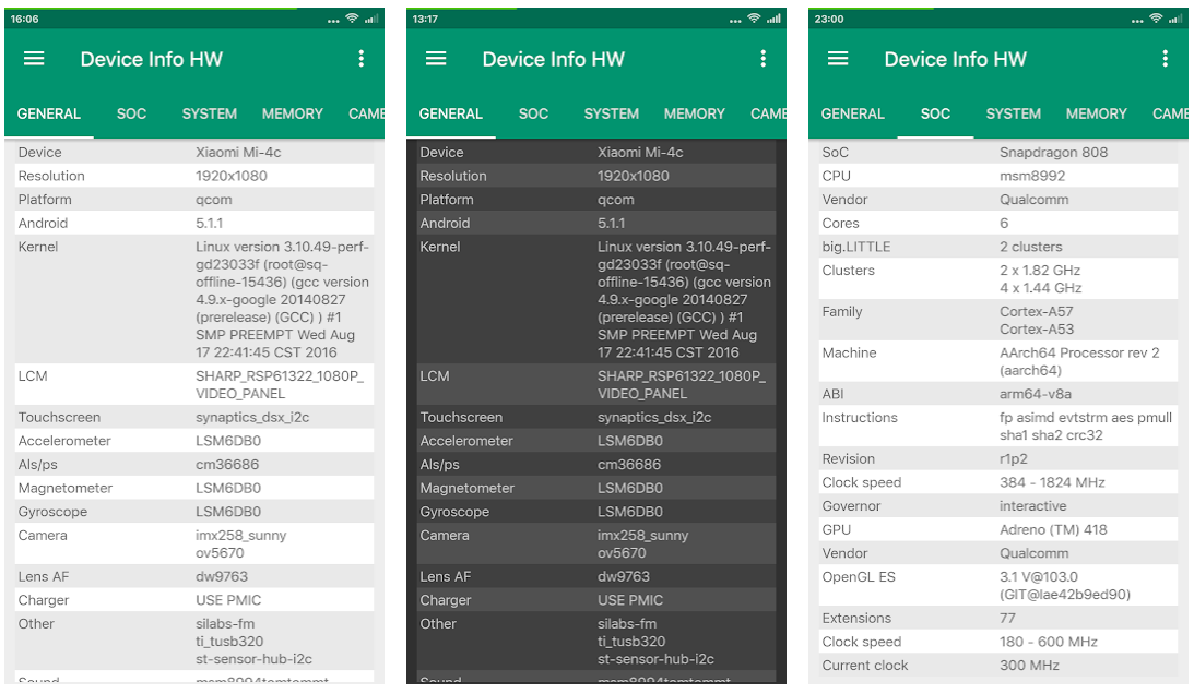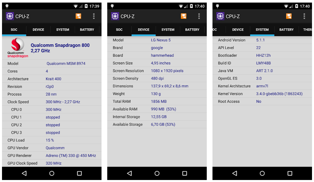 Это простое приложение на русском языке состоит из широкого списка разделов с информацией о телефоне, среди которых «Система» (подробные данные о модели и памяти), «ЦП» (информация о процессоре), «Отображение» (данные о дисплее телефона), «Батарея» (емкость и состояние аккумулятора), а также многие другие.