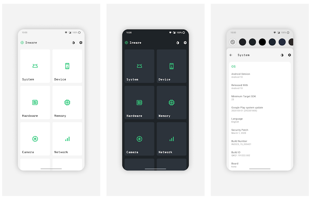 С помощью Inware вы можете взглянуть на все аппаратные характеристики вашего телефона. Вы даже узнаете время безотказной работы, установленный патч безопасности и многое другое. Приложение позволяет настраивать и изменять тему оформления в соответствии с понравившимся вам стилем. Inware доступен бесплатно в Google Play.