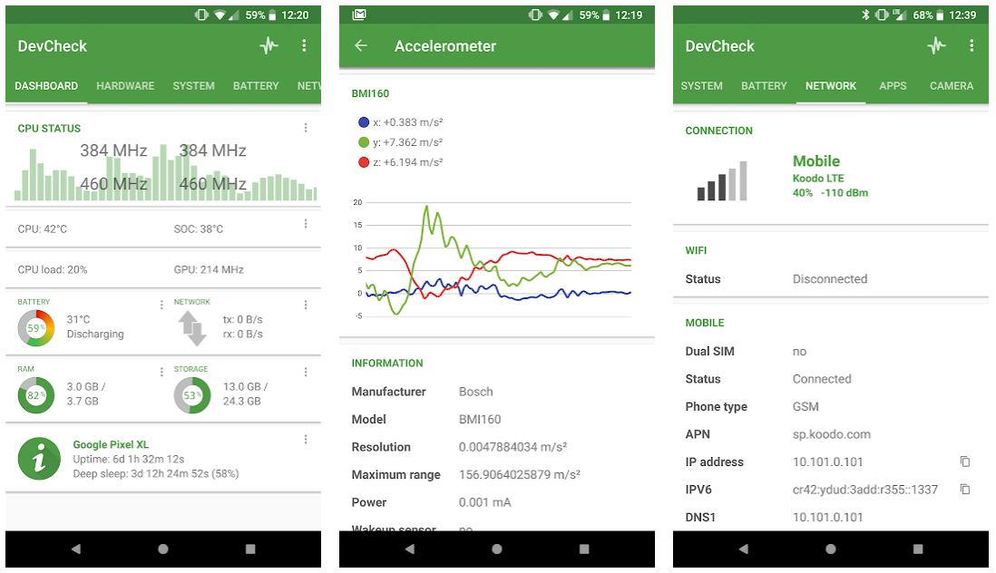 Phone Check (Mobile Phone Checker / Tester & Info) совмещает в себе функции Аиды и Доктора: отображает подробные сведения об аппарате и проверяет его работоспособность. Всего в приложении 11 диагностических тестов: