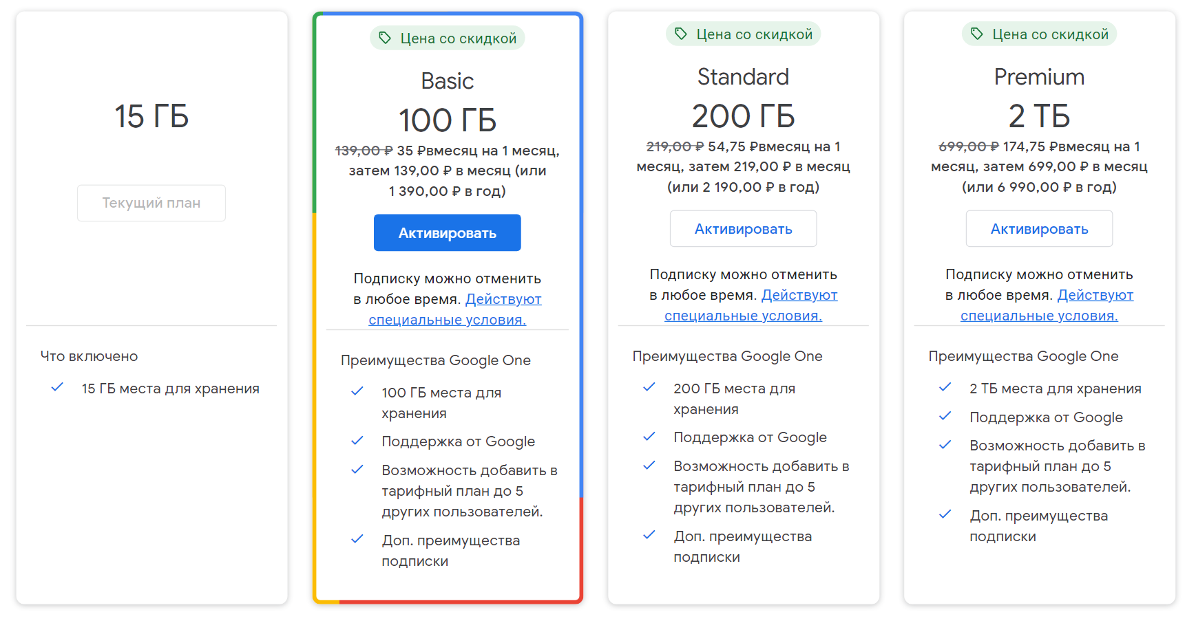 Подписка Google One распространяется в четырех версиях. Помимо бесплатного тарифа, существуют:
