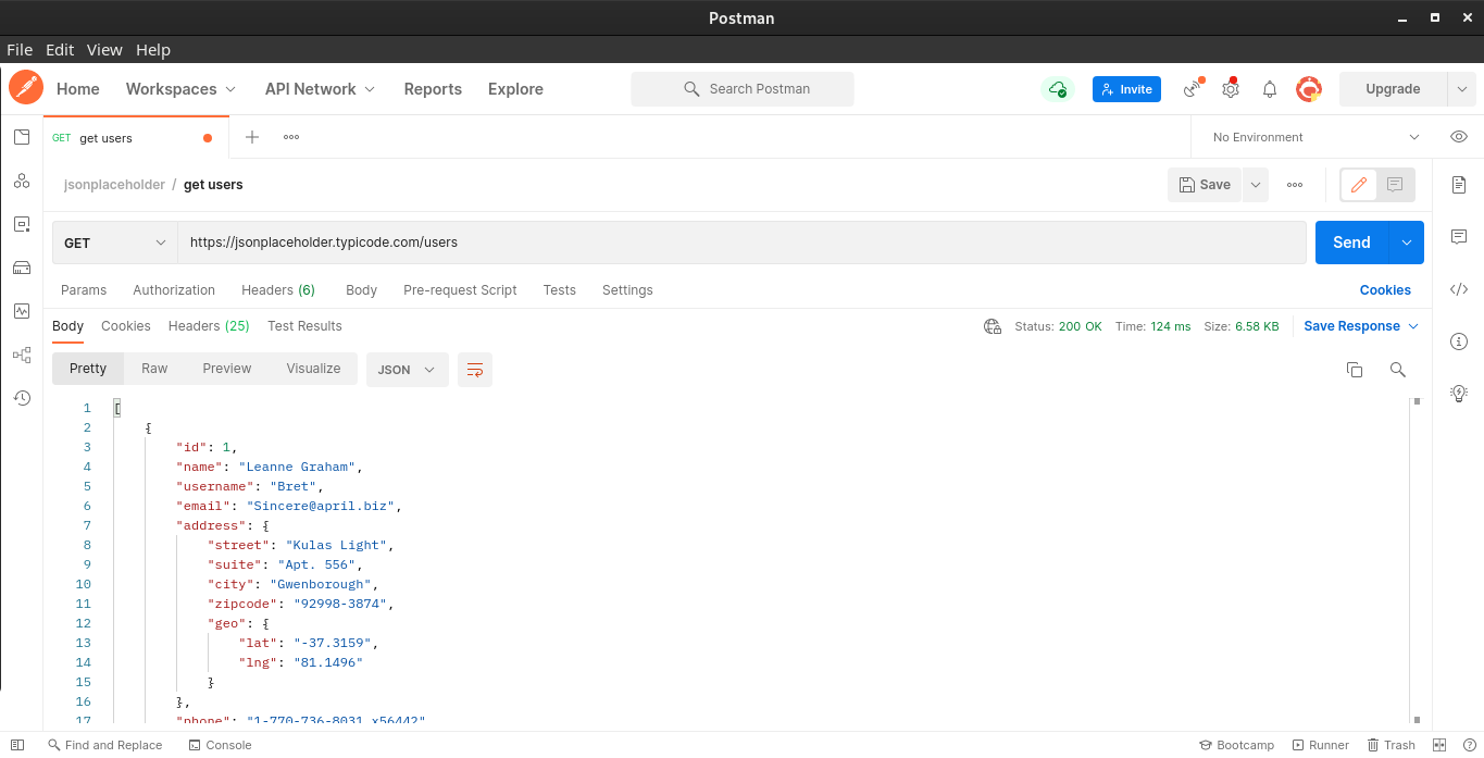 Нажмите «+» → Выберите GET-запрос → Задайте URL-адрес https://jsonplaceholder.typicode.com/users → Send.