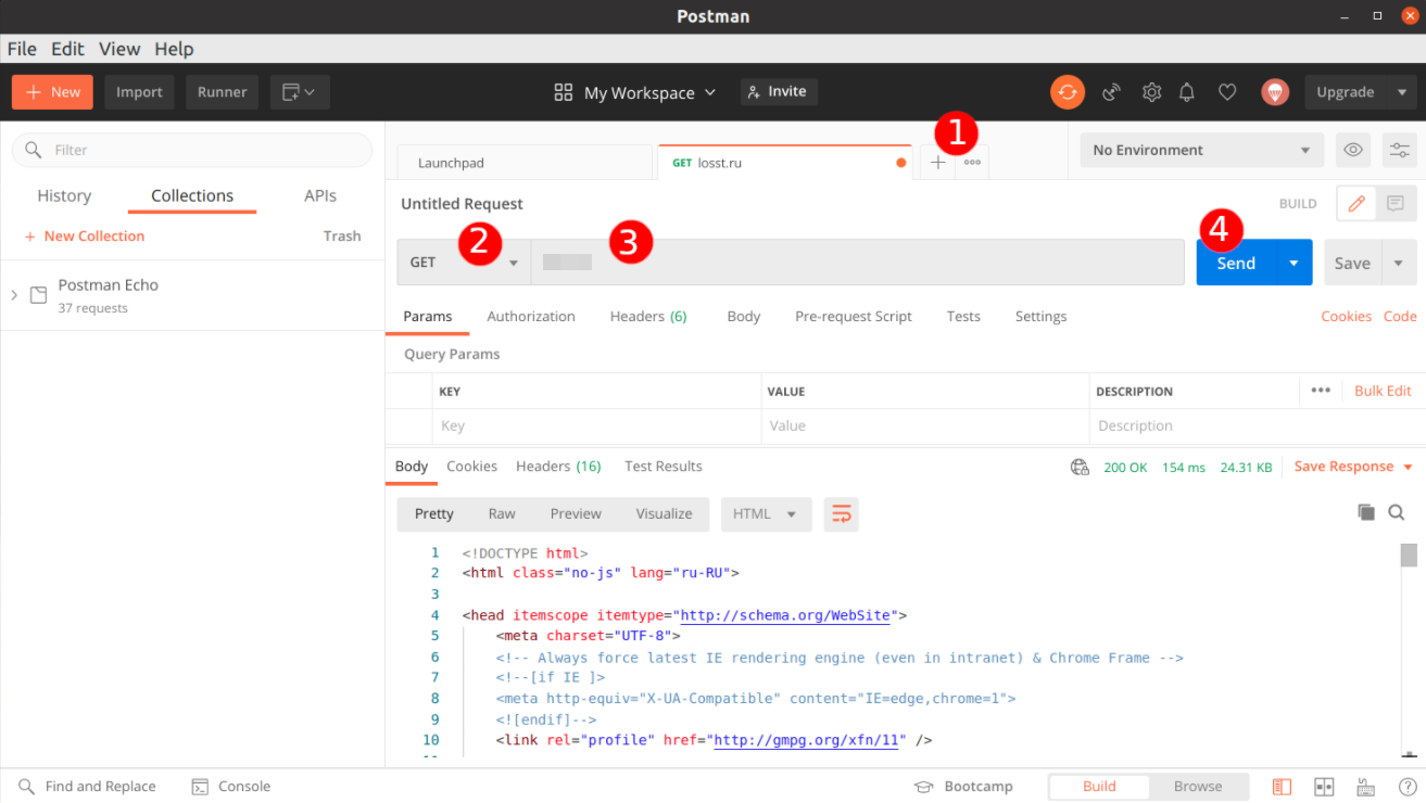 Выполнение простого запроса, без сохранения в коллекции, осуществляется кликом по кнопке со значком <+>. В результате откроется новая вкладка, где есть возможность выбрать тип запроса (GET или POST) и внести домен, который будет открываться. Остается нажать на кнопку Send, которая и запустит процедуру проверки.