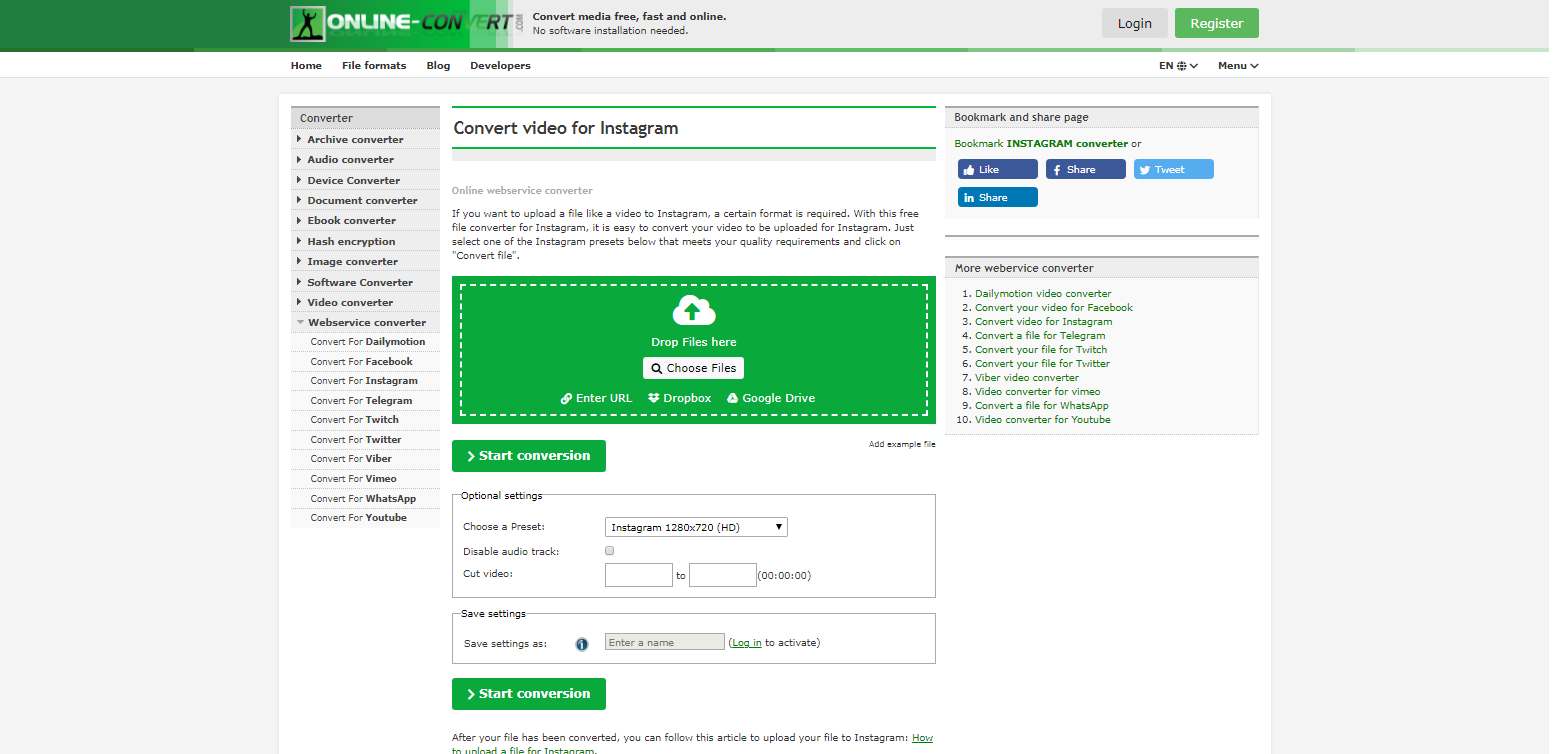 Этот бесплатный инструмент конвертирует все виды цифровых файлов. И у него отдельные страницы для каждой социальной сети, чтобы легко конвертировать отснятый материал в формат для Instagram или YouTube.