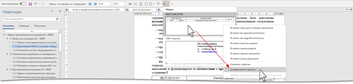 Шаг 1. Команда «Автотекст» с панели быстрого доступа → выбор блока, который следует удалить → ПМ → из контекстного меню выбираем команду Упорядочение и удалить: