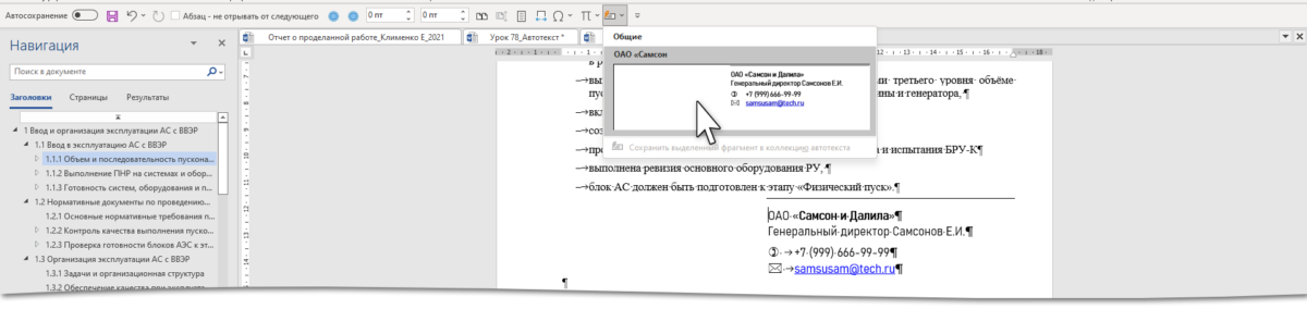 При наборе текста часто приходится заново набирать большие фрагменты текста. Например, название компании с реквизитами или подпись делового письма: фамилия, имя, номер мобильного телефона, адрес электронной почты. Можно, конечно, воспользоваться буфером обмена, то есть скопировать фрагмент текста в буфер обмена и потом вставлять в нужном месте, но это срабатывает только при непрерывном сеансе работы и при условии не переполнения буфера обмена. И здесь нам на помощь придёт такая замечательная функция, как «Автотекст».