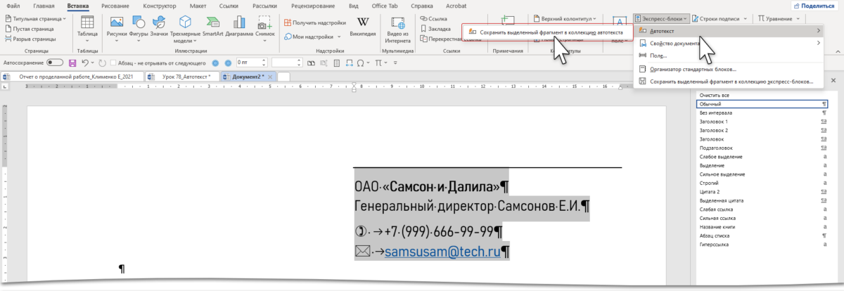 Шаг 4. Заносим текст в коллекцию «Автотекст» (лента Вставка → группа команд Текст → команда Экспресс-блоки → команда Автотекст → команда Сохранить выделенный фрагмент текста в коллекцию «Автотекст» )