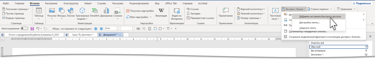 Шаг 1. Устанавливаем кнопку вызова коллекции «Автотекст» на Панель быстрого доступа (лента Вставка → группа команд Текст → команда Экспресс-блоки → ПМ на команде Автотекст → команда Добавить на панель быстрого доступа):