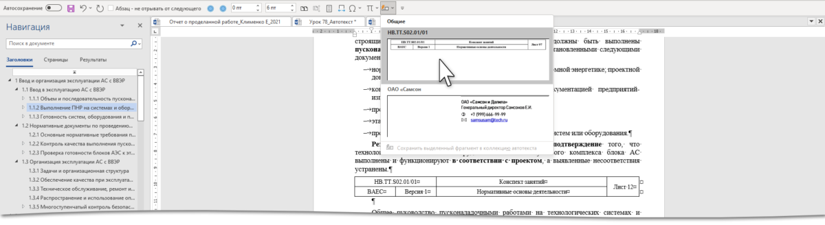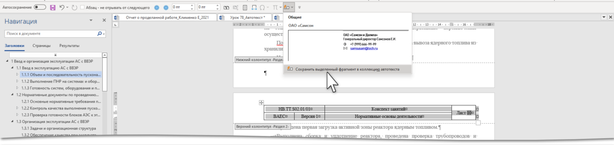 Шаг 4. Я открыла другой документ, вошла режим колонтитулов и сохранила таблицу в коллекцию «Автотекст» (Пользуюсь только кнопкой на Панели быстрого доступа):