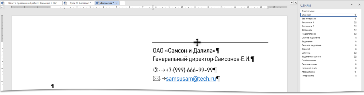 Я изменила гарнитуру шрифта, начертание, добавила линию интервал после абзаца, сделала абзационный отступ 7,75 см и вместо слов «телефон» и «адрес» применила значки-пиктограммы.