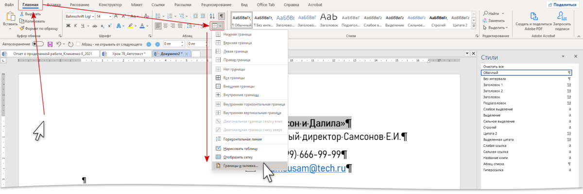 Маленькое лирическое отступление. Горизонтальные линии, применённые к месту, очень украшают документ. И очень часто пользователи просто берут автофигуру «Линия» из коллекции автофигур. А это приводит к нежелательным последствиям. Например, линия может убежать за пределы страницы. Лучше воспользоваться инструментом «Границы» (выделяем абзац, который будет дополнен горизонтальной линией) → лента Главная → группа команд Абзац → команда Граница → команда Граница и заливка из выпадающего меню):
