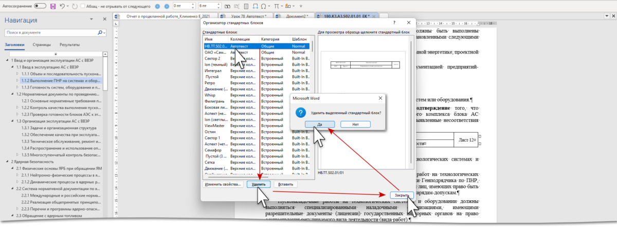 Шаг 2. После команд Удалить и Закрыть появляется рабочее окно, которое требует подтверждения «Удалить выделенный стандартный блок?»: