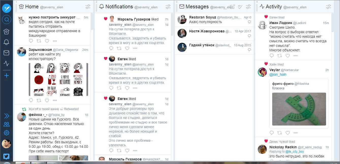 Сервис показывает как бы четыре экрана, которые можно пролистывать независимо друг от друга: лента новостей, сообщения, упоминания и активности. Это позволяет не переключать разные вкладки, а смотреть все на одном экране.