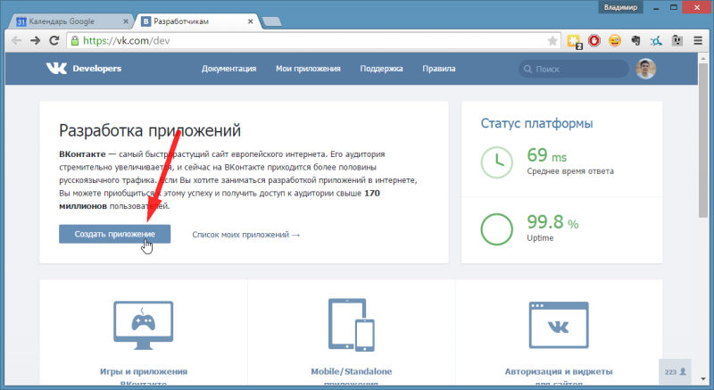 6) Переходим ко Вконтакту. Зайдите на страницу создания приложения Вк и нажмите «Создать приложение».