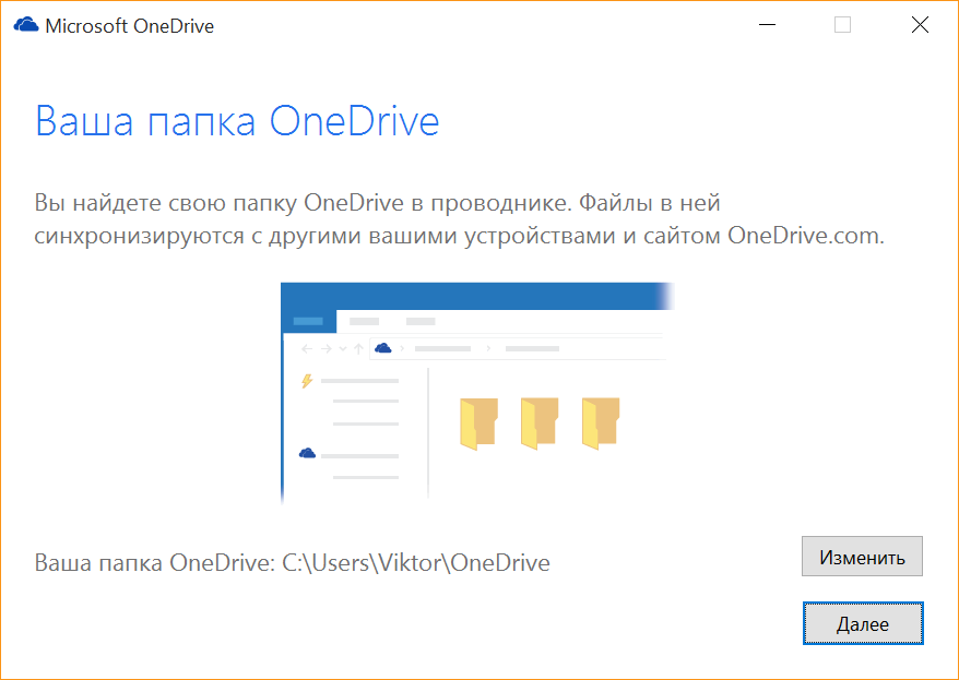 4. Переключитесь на окно начала работы с облачным хранилищем, где вам нужно будет ввести логин и пароль от своей учетной записи. После этого, вам будет предложено изменить место для папки OneDrive или согласиться с её местом по умолчанию (кнопка «Далее»). Нажмите на кнопку «Изменить»