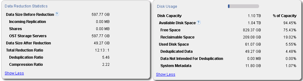 Как видно из информации из управляющего интерфейса, общее сокращение объема после обработки сокращено в 12 раз (Total Reduction Ratio в блоке Data Reduction Statistics), при этом сокращение объема более чем в 5 раз приходится именно на обработку дедупликацией (Deduplication Ratio в блоке Data Reduction Statistics), с последующем сокращением дедуплицированных данных алгоритмом компрессии в более 2 раз(Compression Ratio) в блоке Data Reduction Statistics. Помимо самих данных  требуется хранить метаданные, обеспечивая целостность данных, которые на данном наборе хранения занимают 11,8 ГБ (System Metadata в блоке Disk Usage), большей частью которых являются метаданные используемые при дедупликации данных.
