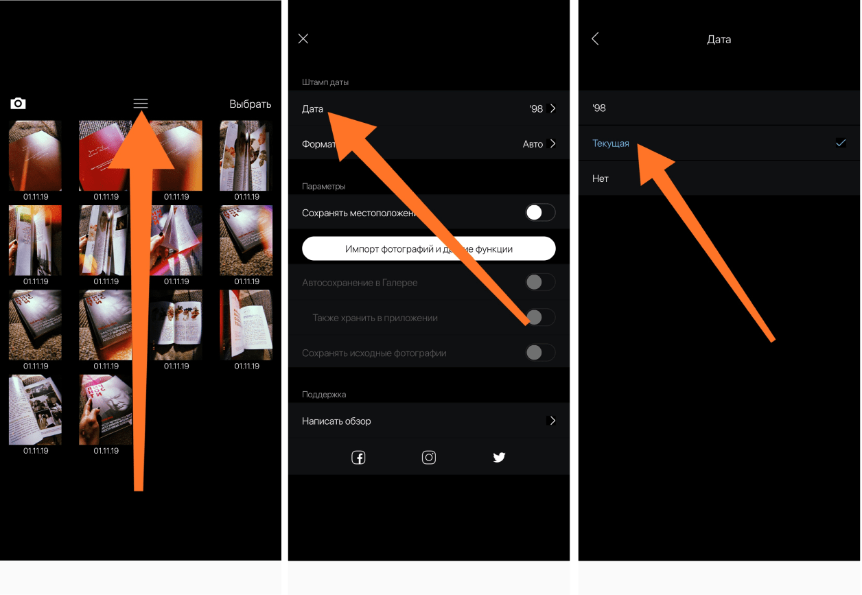 Посмотрите примеры пленочных эффектов с датой сделанных в приложении HUJI.