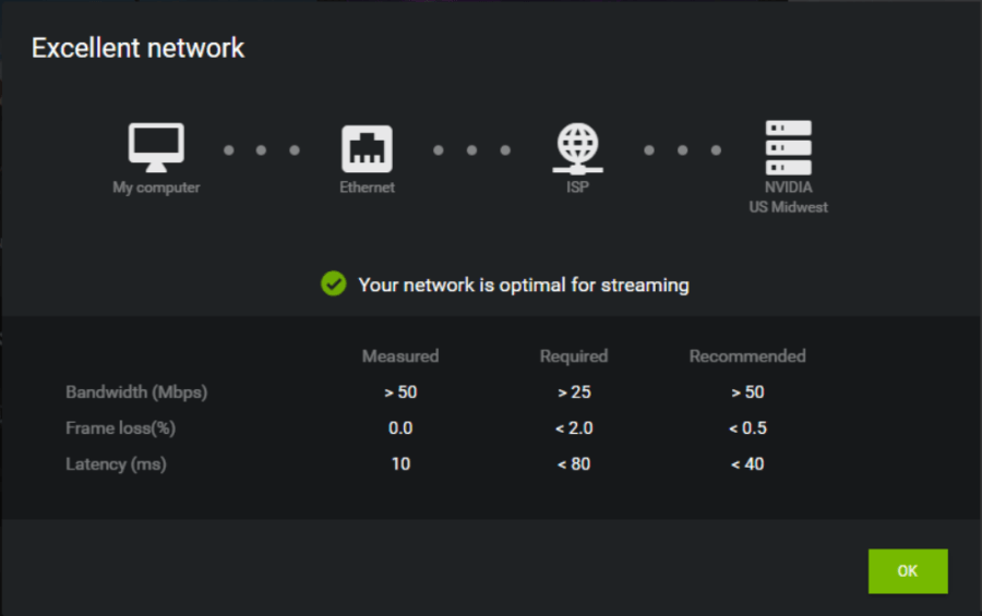 При каждом запуске Geforce Now тестирует скорость соединения и сообщает о найденных проблемах. Впрочем, даже если приложение заявит о полной непригодности вашей сети для стриминга — можно проигнорировать это предупреждение, запустить игру и получить в итоге отсутствие проблем с пингом и качеством картинки. Сложности наиболее вероятны в пиковые часы нагрузки.