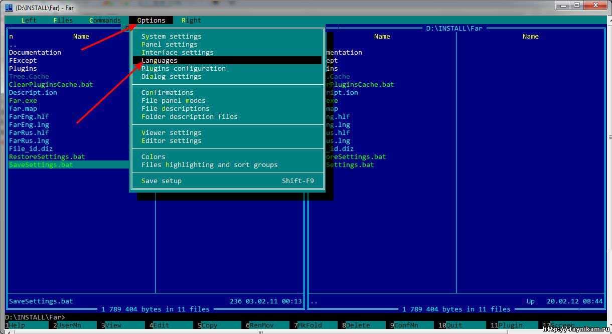 прежде всего поменяем язык интерфейса с английского на наш могучий и правдивый русский язык. Для этого запускаем Far и жмем на клавиатуре кнопку F9