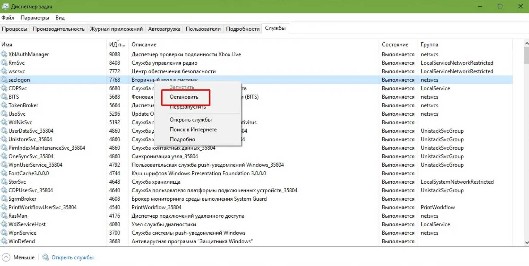 Они отключаются точно так же, как и программы автозагрузки, нажатием ПКМ и «Отключить» или «Остановить».