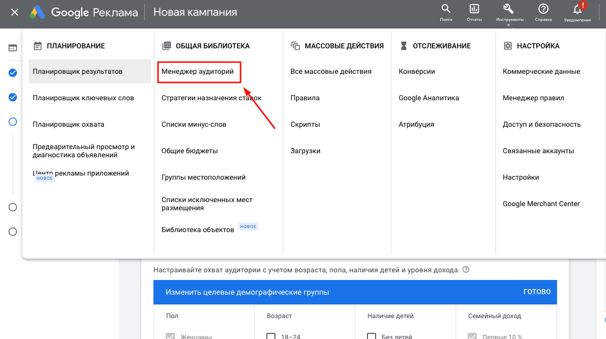 Найти заинтересованных пользователей среди тех, кто уже посещал ваш сайт гораздо проще, чем вы думаете! В Google Ads есть специальная функция, позволяющая делать рекламные показы определённым группам пользователей. Настроить такие аудитории можно через инструмент «Менеджер аудиторий», который находится в основном меню «Общая библиотека».
