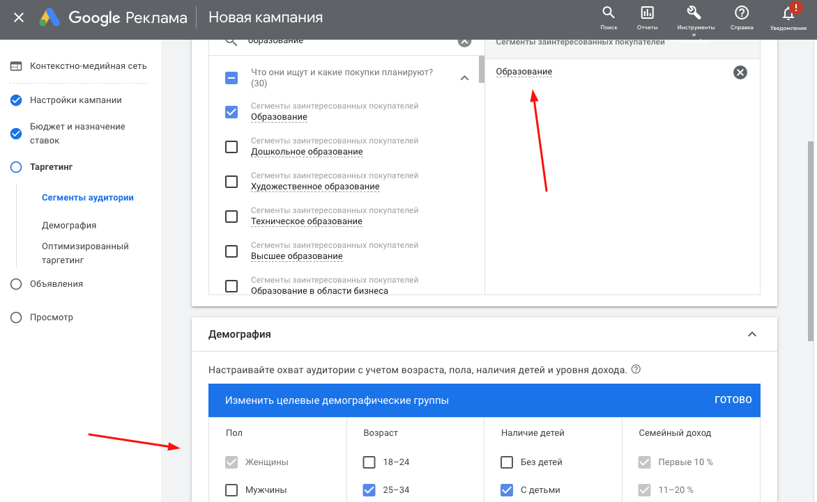 Для этого выберите нужный сегмент аудитории или добавьте демографические данные потенциального клиента.
